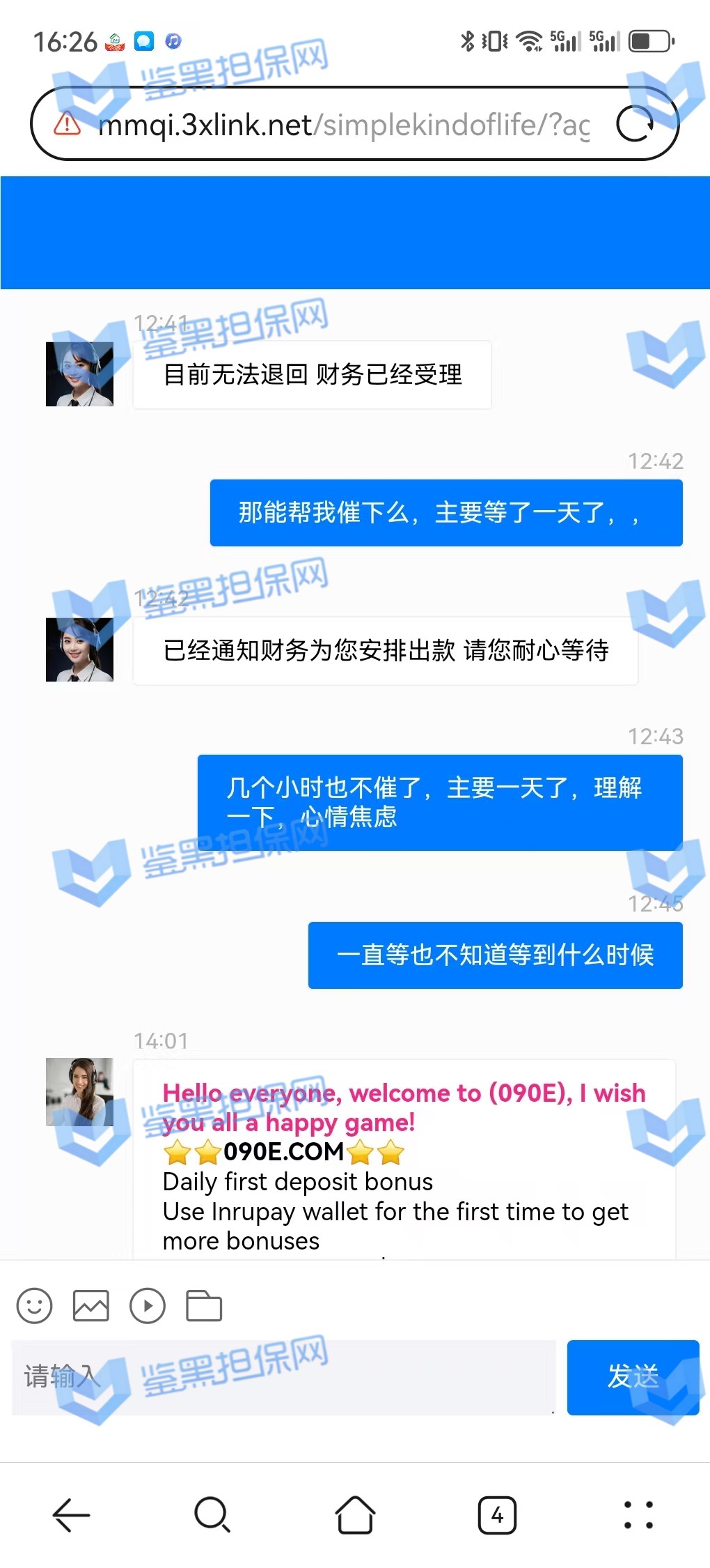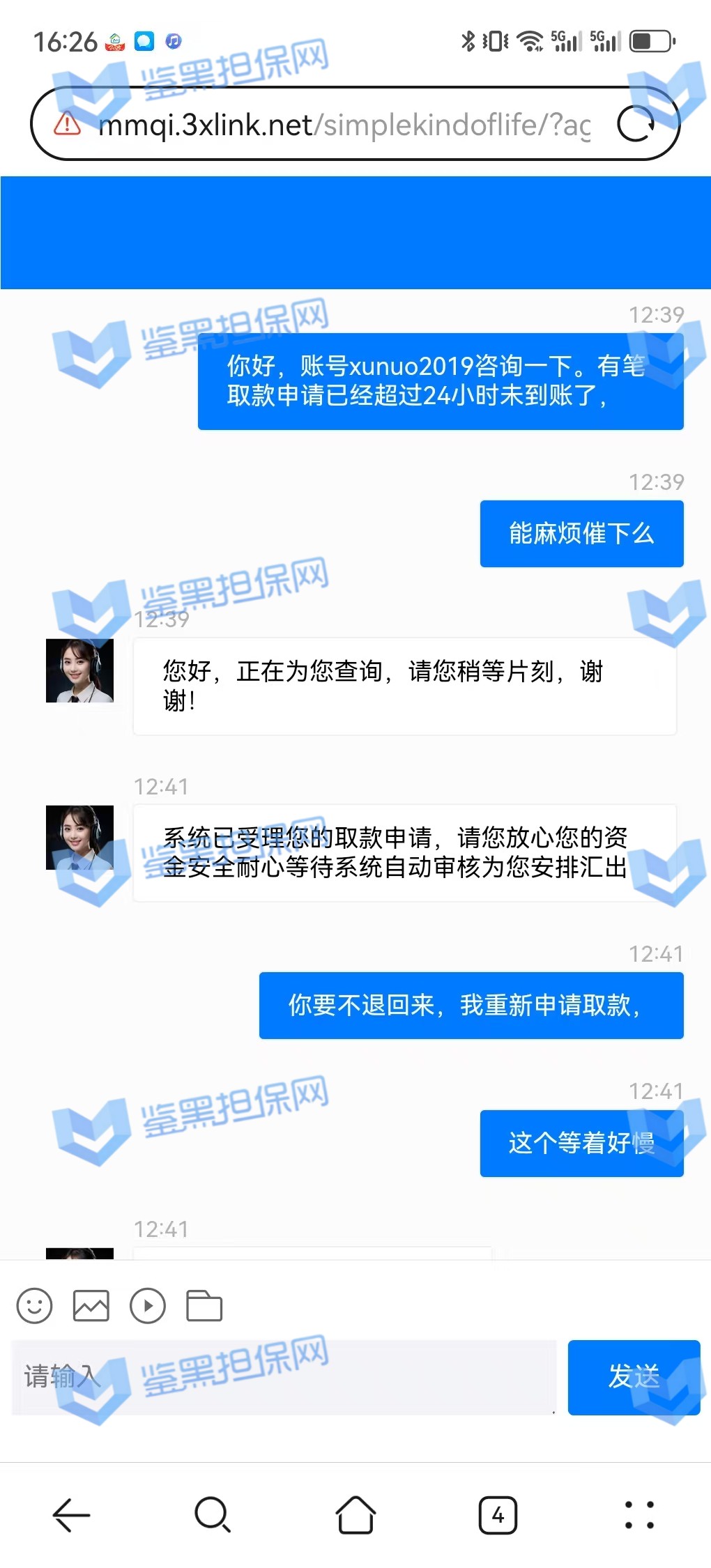 2、该会员多次联系平台追问提款到账情况,多次被在线客服以财务部门受理中,需要耐心等待到账成功,24小时还是未到账成功。