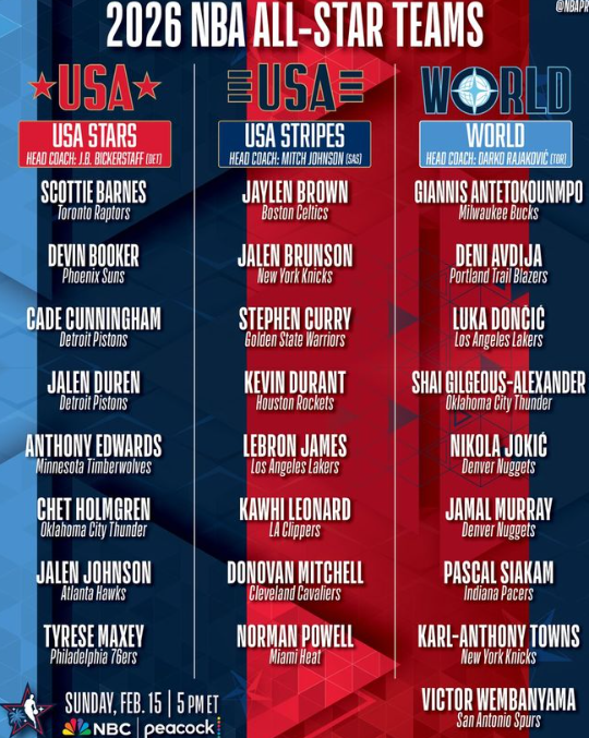 2026年NBA全明星依旧选拔24名球员,东西部联盟各12人。两个联盟的5名首发球员,由球迷(占比50%)、现役NBA球员(占比25%)及媒体评审团(占比25%)共同投票选出;各联盟的7名替补球员则由NBA各队主教练挑选产生。今年的全明星球员选拔将打破场上位置限制。